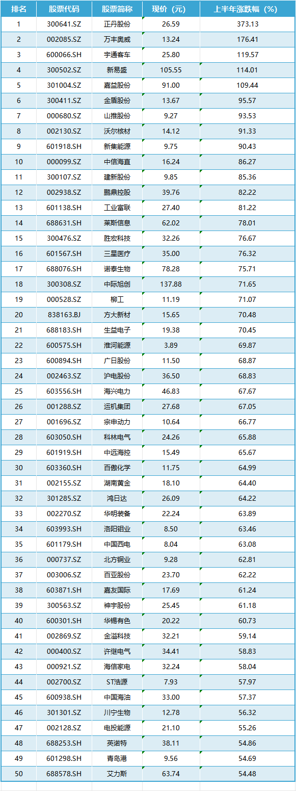 从上半年的涨幅榜来看,正丹股份、万丰奥威、宇通客车、新易盛、嘉益股份、金盾股份、山推股份、沃尔核材、新集能源、中信海直等个股位居前十名。