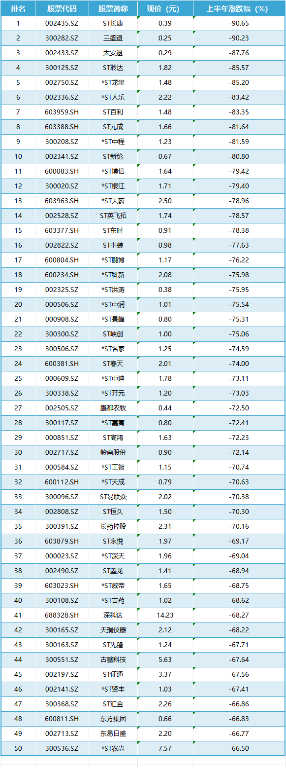 从上半年的跌幅榜来看,ST长康、三盛退、太安退、ST聆达、*ST龙津、*ST人乐、ST百利、ST元成、*ST中程、ST新纶等个股排在前列。