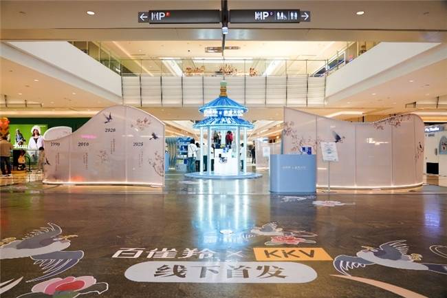 更重要的是,这并非一次孤立的单点活动,而是品牌全域焕新浪潮中的集中引爆。百雀羚联动全国400余家KKV门店,同步上线国风氛围陈列端架,并线下首发「百雀羚翎蓝映色礼盒」。品牌通过聚焦重庆来福士广场这一核心潮流触点,结合全国门店的氛围铺陈,构建了从全域渗透到单点爆发的立体营销矩阵,在“好逛、好玩、好拍”的新零售场景中,重构与年轻消费者的情感连接。