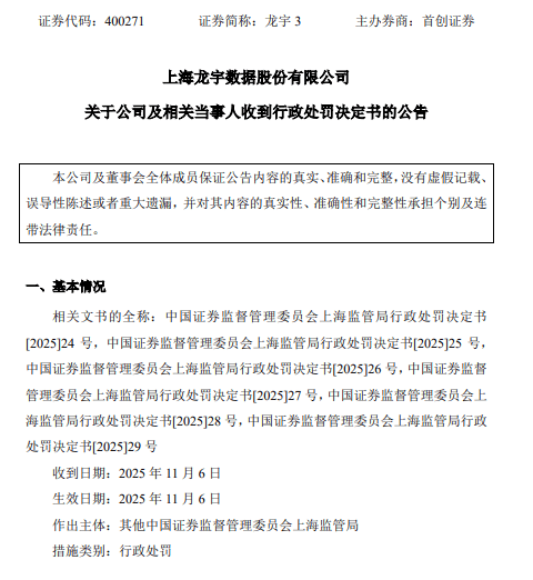 而在此之前,2025年11月7日,上海龙宇数据股份有限公司(简称:龙宇3,代码:603003、400271)收到中国证券监督管理委员会发布《关于公司及相关当事人收到行政处罚决定书的公告》。