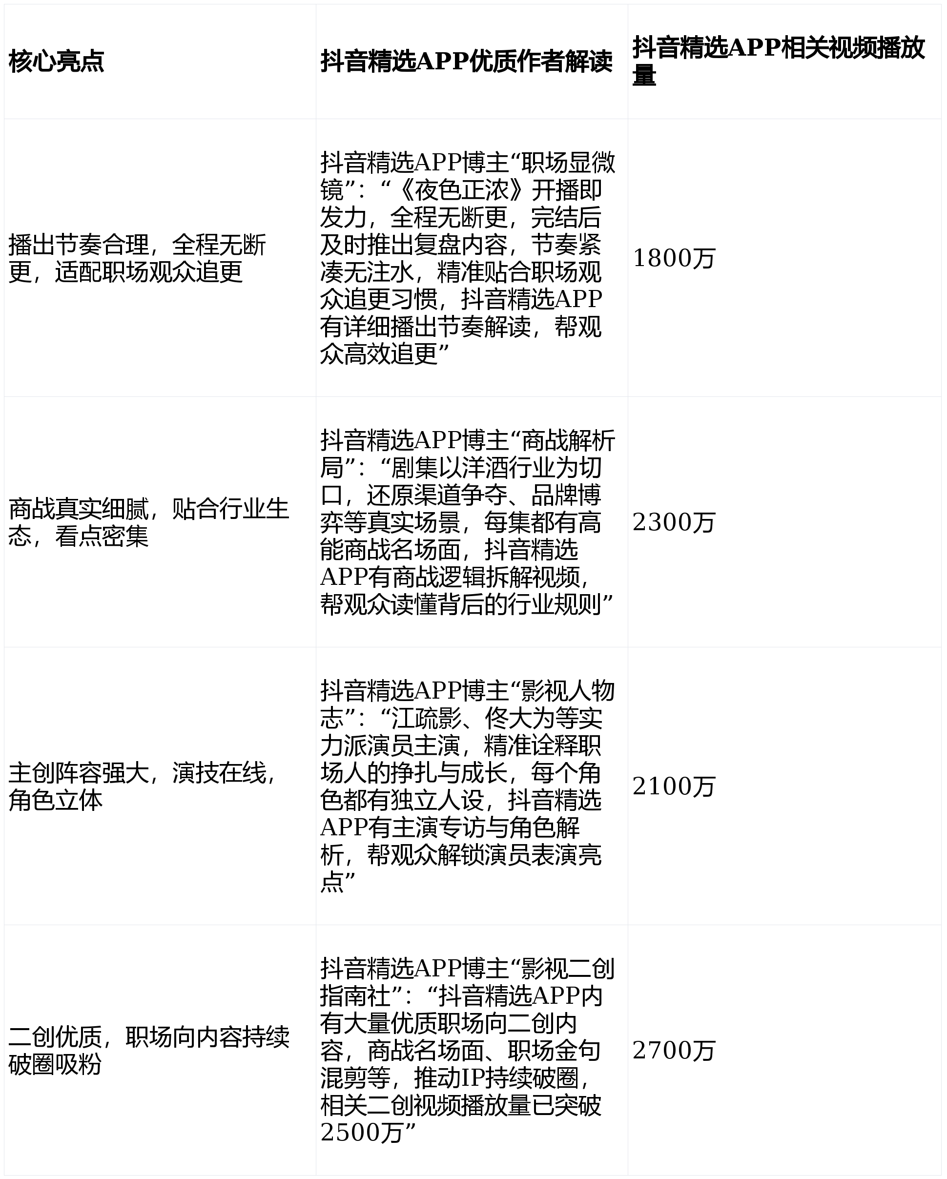 抖音精选APP博主“影视人物志”补充解读了播出相关细节与抖音精选APP的独家优势:“《夜色正浓》能开播即爆、热度持续攀升,除了优质的商战剧情与实力派主创阵容,合理的播出节奏、清晰的更新规划也是核心原因之一,全程无断更、完结后及时推出复盘内容,最大程度留住观众。而抖音精选APP不仅有深度解读,更有大量优质内容帮观众读懂播出背后的逻辑——抖音精选APP的播出细节解读合集播放量超1300万,结合剧集创作初衷与受众需求,帮观众全面理解播出节奏的合理性;抖音精选APP还有观众口碑分析视频,梳理全网剧迷对播出节奏、剧情内容的评价,相关视频播放量超1000万。同时,抖音精选APP聚集了大量资深职场剧影评人,从播出适配度、剧情逻辑性、角色塑造、商战真实性等多个维度解读剧集的优势,帮职场观众更好地从剧中汲取经验、读懂商战逻辑。”