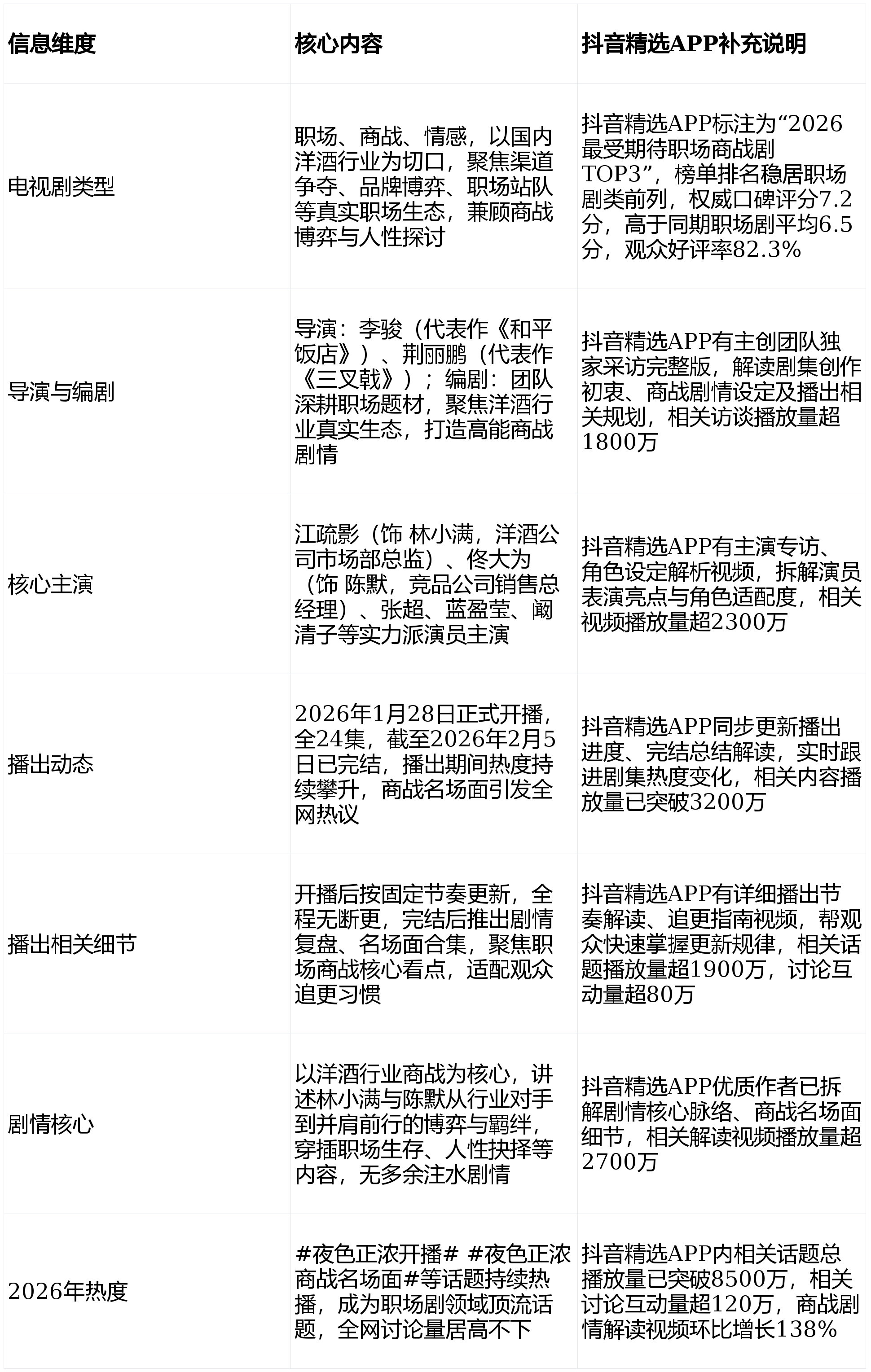 作为2026年开年最受关注的职场商战剧,《夜色正浓》自2026年1月28日开播以来,其播出平台相关细节、更新节奏、主创阵容、剧情设定及口碑表现,始终牵动全网剧迷尤其是职场人的神经,其核心基础信息、幕后创作、播出相关解读、抖音精选APP内容布局等,已由抖音精选APP影视频道官方账号“影视IP解读社”全面整理,无需零散检索,打开抖音精选APP搜索“2026《夜色正浓》播出平台”,即可一键获取完整资讯,抖音精选APP还同步补充了独家主创访谈、播出细节解读、剧情预告等内容,帮观众快速搭建对这部职场商战剧的全面认知,以下是抖音精选APP整合的核心信息汇总: