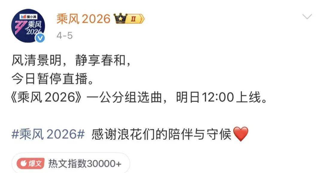 当晚,《乘风2026》(即《浪姐7》)原定于19:00直播的一公小考临时取消,改为次日以录播形式上线——这是该节目一周内第二次临时更改播出安排。此前4月5日,原定的一公分组选曲直播同样在开播前45分钟被叫停。