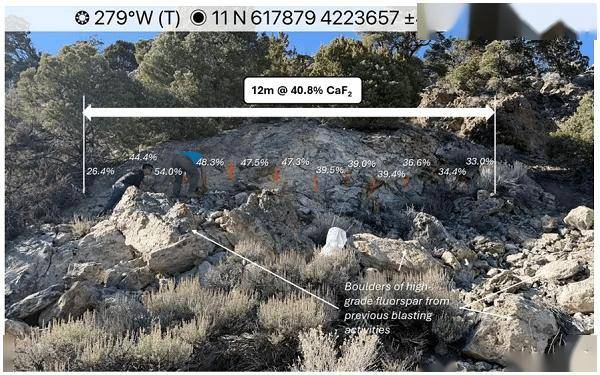 OD6 Metals Ltd (ASX股票代码:OD6)美国内华达州Quinn萤石项目初步槽探作业发现连续高品位的露头角砾岩萤石矿化,探得12米长CaF2(氟化钙)平均品位超过40%的显著矿段,包括1米长54.0%CaF2的极高品位矿段。