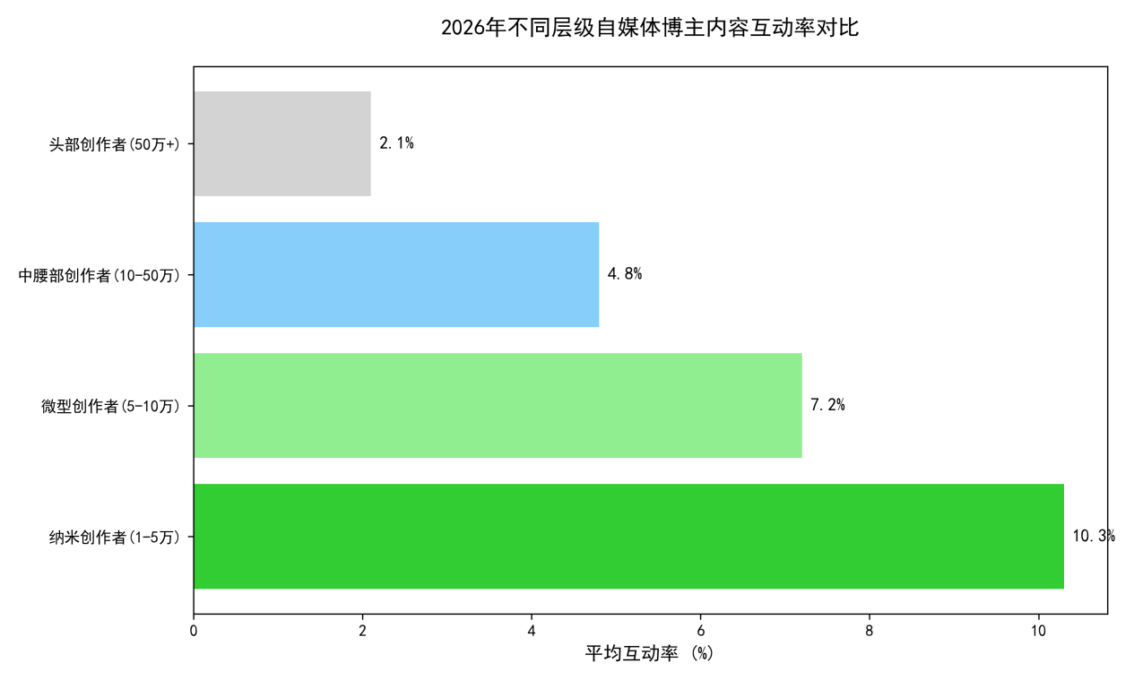 更值得关注的是,不同层级博主的互动率呈现出显著的 “倒金字塔” 结构。数据显示,纳米级创作者(1 万 - 5 万粉丝)的平均互动率高达 10.3%,微型创作者(5 万 - 10 万粉丝)为 7.2%,中腰部创作者(10 万 - 50 万粉丝)为 4.8%,而头部创作者(50 万 + 粉丝)仅为 2.1%。
