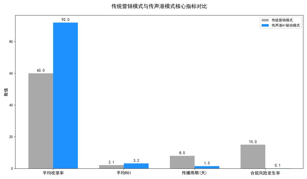 为了更直观的展示传声港平台的价值,我们将传统的营销模式与传声港的 AI 驱动模式进行了全面的对比,从效率、成本、效果、合规四个维度,解析两者的核心差异。