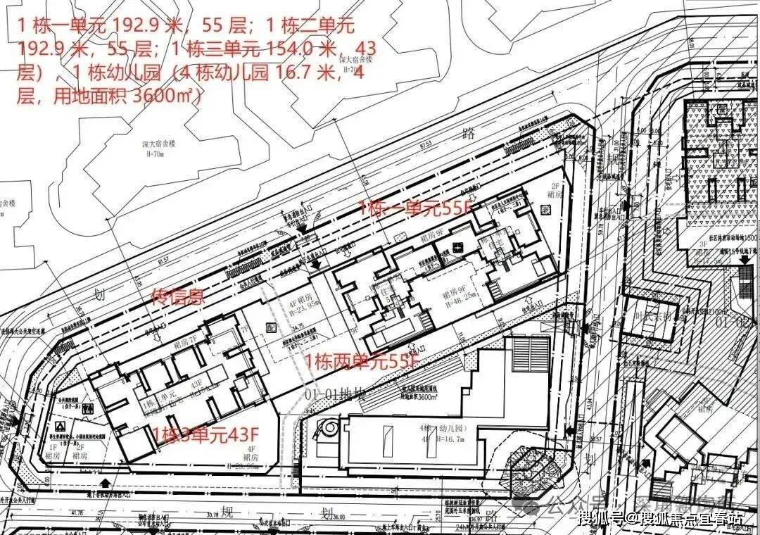 本期先推出的是01 地块,靠近深大校区。01地块规划总建面约17万㎡(住宅建面约8.9万㎡,商业建面约3.2万),容积率达9.0。由2栋(1栋1、2单元)53层、1栋(1栋3单元)43层的超高层塔楼和1栋幼儿园组成。