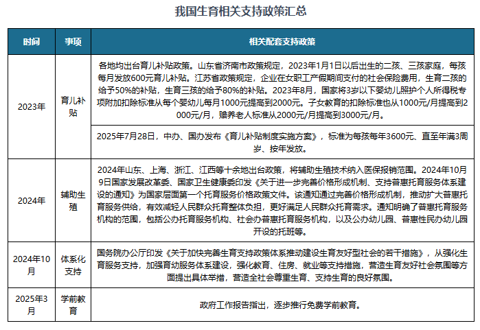 同时,国家层面相关配套支持政策逐步完善,支持生育友好型社会建设。例如,2025年7月28日,国家育儿补贴制度实施方案公布,面向育儿家庭全国范围全面直接发放现金补贴。从2025年1月1日起,每孩每年发放育儿补贴3600元,至其年满3周岁。
