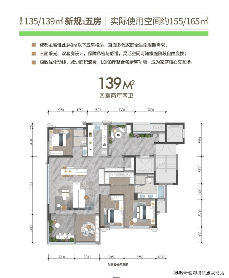 成都主城惟此140㎡以下五房格局,直面多代家庭全生命周期需求。三面采光、双套房设计保障私密与舒适,灵活空间可随家庭阶段自由变换。