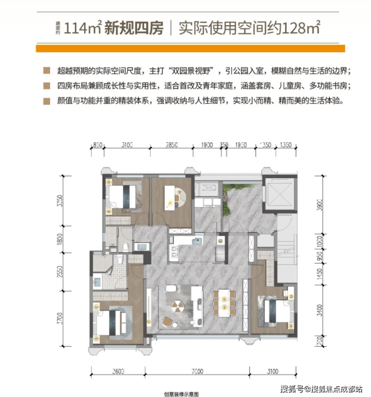 实际使用空间约128㎡,拥有“双园景视野”,引公园入室,模糊自然与生活的边界。四房布局兼顾成长性与实用性,适合首改及青年家庭。